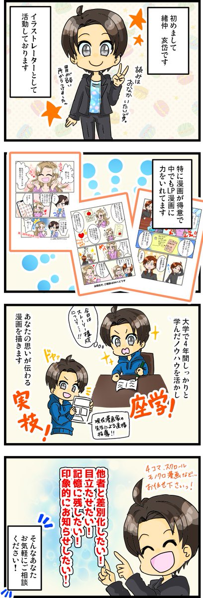 簡単な自己紹介漫画です。 文字や一枚のイラストもいいけど、印象に残る自己紹介しませんか? 大学でしっかりと学んだノウハウを活かし、あなたの想いが伝わる漫画を描きます☺️ お気軽にご相談くださいね✌️✨ #漫画が読めるハッシュタグ #LP漫画