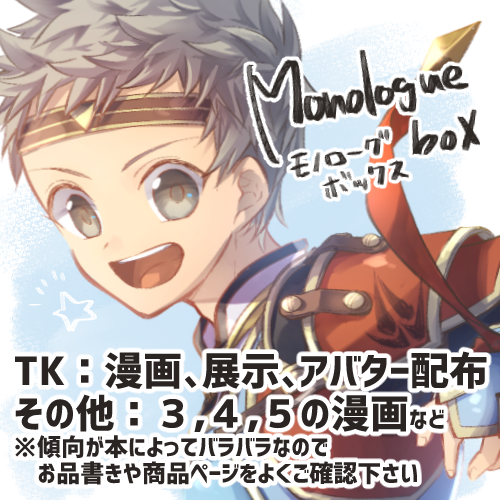 #星祝祭3 #星祝祭3_配置 #星祝祭3_お品書き 祝祭のスペース決まったし、色々告知です! 【水滸図1:お8】 Monologue box ・50年前本の後編がようやくできたのであります🔥 ・夏だし頒布終了してる幻水4のギャグ本web再録の展示します🦀 ・紡時のらくがきまとめ展示します🌱