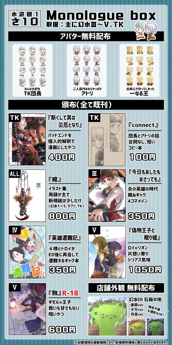 #星祝祭2 #星祝祭2_参加 #星祝祭2_お品書き 店舗:水滸図1 さ10 12/11星の祝祭Ⅱ参加します!幻水3~5、TKの取扱がありますが今回はTKとして参加です😚 通販は既刊のみですが、アバター&店舗外観の配布があるので是非使ってやってください!(店舗外観は事前にツイッターで配布しているものと同じ)