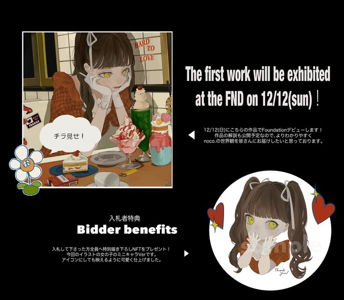 I exhibited my first work at foundation(@withFND )! I wrote a commentary, so please enjoy this story 🍰💔 Auction▶︎foundation.app/@nocotyo003/~/… #Foundation #withFND #NFT #nftart #NFTJapan #nftcollector #NFTCommunity