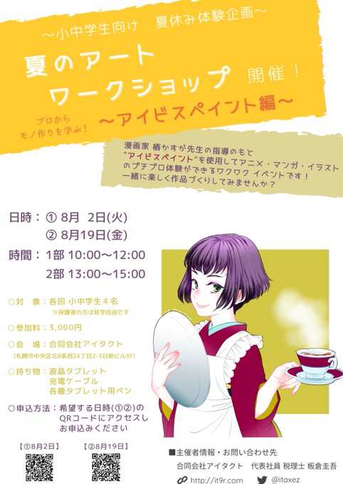 【札幌夏休みイベント告知】小中学生向けのアイビスペイントワークショップを開催‼︎ 講師は @tsubakasu 先生です。 eventregist.com/p/fjAXAqAlinFM… #アイビスペイント #小学生絵師 #中学生絵師 #札幌夏休みイベント