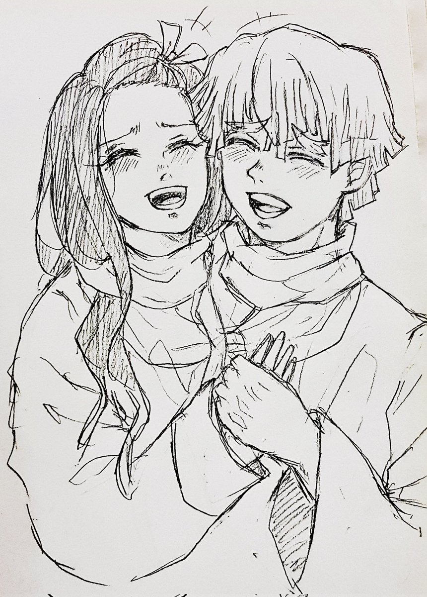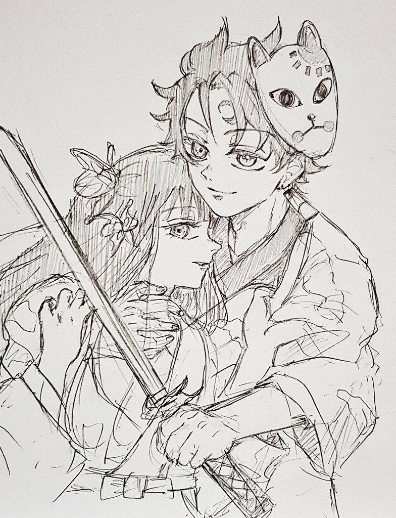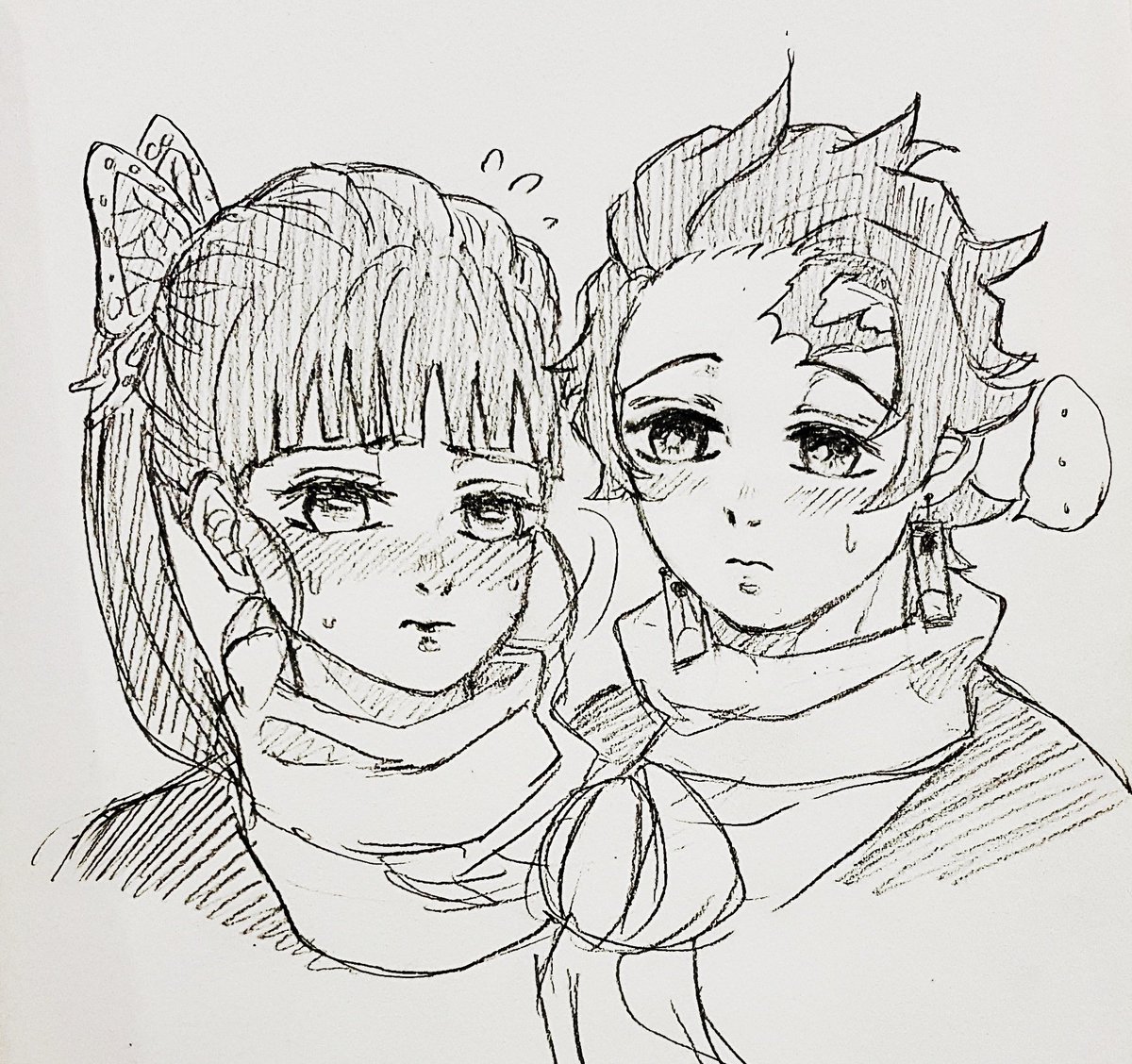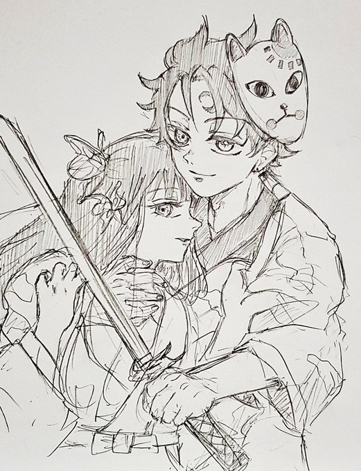 たんかなrkgk また鉛筆画♪ 🎴🌸は結婚しているが、🎴🌸は再び最終選別の服を着ている(懐かしさ🤭)🌸は🎴が左腕を上げるのを手伝う......👍 漫画の表紙の1巻のこのポーズかっこいいと思う😳