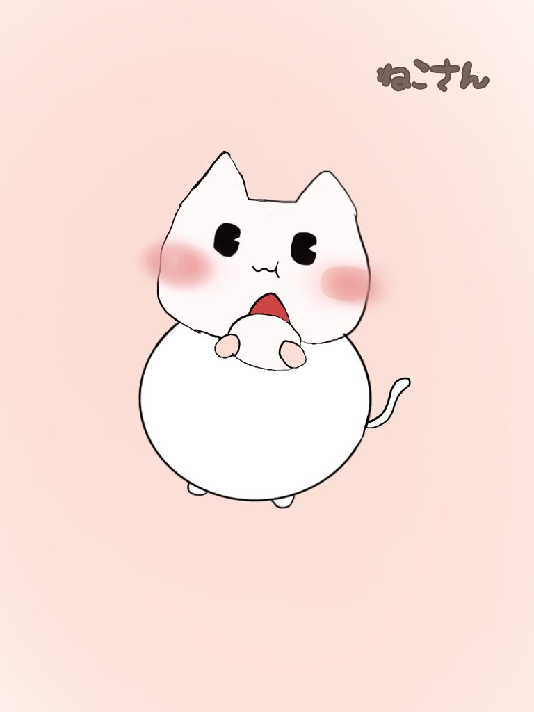 アイコン「ねこさん」のイラスト。 手には好物の苺大福🍓 ねこさんはぽっちゃり体型です( ´∀` ) #イラスト好きと繋がりたい #イラスト #アイビスペイント