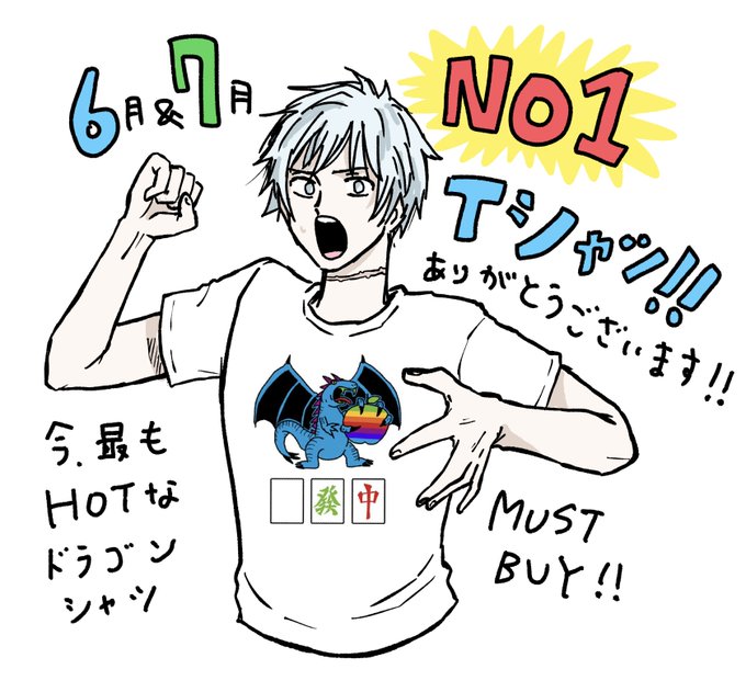 ジャンプ+TシャツSHOPの6月売上ランキングでハンサムマストダイのレインボーアップルドラゴン白發中Tシャツが1位になりました🏆 すごい!!!Tシャツを買ってくれたみなさま誠にありがとうございます‼️🌈🍎🐉🀄️ twitter.com/shonenjump_plu…
