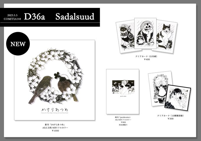 【イベント参加のお知らせ】 COMITIA144 【D36a】Sadalsuud コミティアのお品書きです。 新刊あり〼 さっそく書き忘れてますが切り絵の原画もなにかしら持っていきます〜✋ #コミティア144 #comitia144