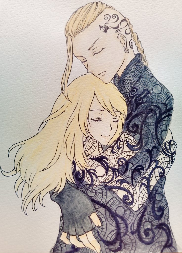 #このタグを見た人はラフ画とその完成絵を見せる シオンちゃん、元々は子守りしながら子の落書き帳に描いてた(ごめんな)んだけど、割と気に入ったからスケブに写して着色した🎨🖌️ 普段はいきなりスケブに十字のアタリつけたら1枚目くらいまで一気に書き殴って線を整えてそのまま塗るよ!雑だね!!😇