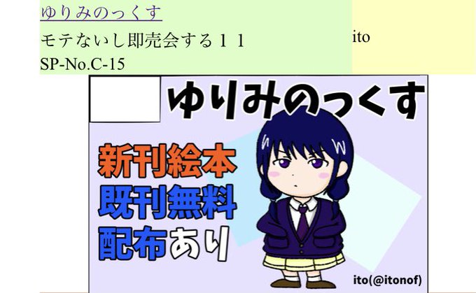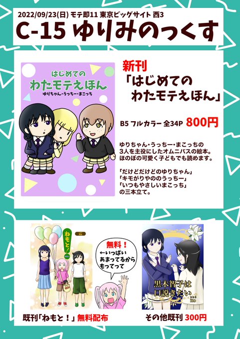 26 36 モテ即11のお品書き! 9/25(日)東京ビッグサイト西3 C-15 ゆりみのっくす 新刊「はじめてのわたモテえほん」 B5フルカラー全34p800円 ゆりうちまこ主役のオムニバス絵本!サンプルは引用参照! 既刊「ねもと!」は無料配布 その他既刊300円 よろしくお願いします😆✨ #モテ即11 #わたモテ #watamote twitter.com/itonof/status/… 22/09/23 14:34