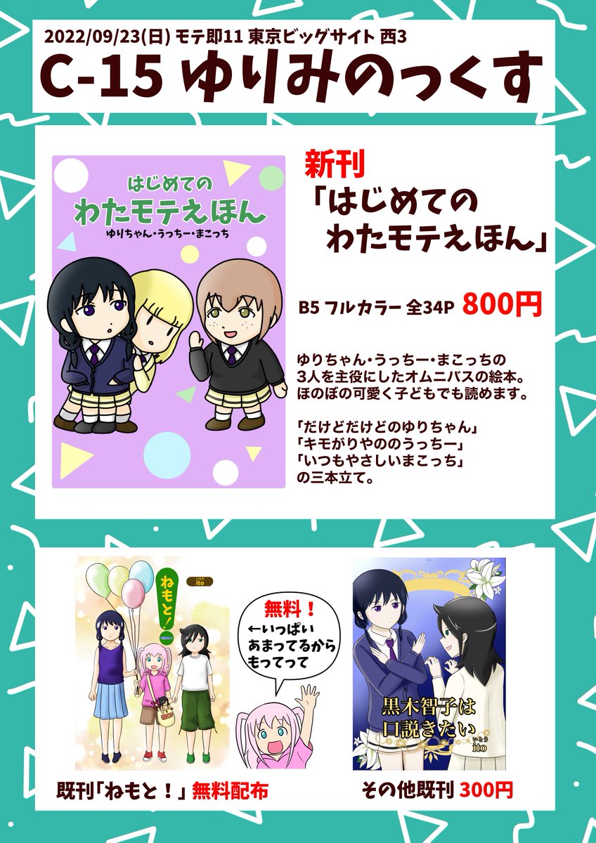 モテ即11のお品書き! 9/25(日)東京ビッグサイト西3 C-15 ゆりみのっくす 新刊「はじめてのわたモテえほん」 B5フルカラー全34p800円 ゆりうちまこ主役のオムニバス絵本!サンプルは引用参照! 既刊「ねもと!」は無料配布 その他既刊300円 よろしくお願いします😆✨ #モテ即11 #わたモテ #watamote twitter.com/itonof/status/…