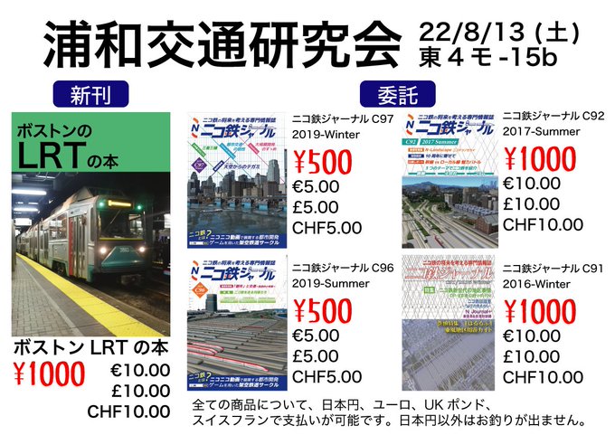 12 10 #C100お品書き が完成しました! 今回はボストンのLRTで一冊書きました。ニコ鉄ジャーナルの既刊も少数ですが持参します。 8月13日(土曜日)、東4ホールモ-15bでお待ちしております! 22/08/11 17:23