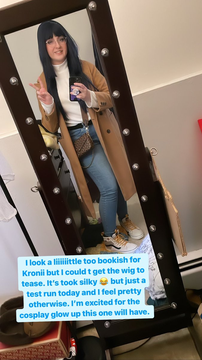 Went to a cosplay event today! Tested out my cosplay for @ourokronii’s new outfit but I still need to tease the wig a bit to get the pointy head pieces and embroider the bow on the top. #krotime #kronillust #cosplay #HololiveEN