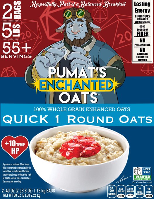A throwaway line from @TheVulcanSalute to @matthewmercer on last week's episode of Critical Role inspired this fake box art of Enchanter Pumat Sol's line of breakfast oats #criticalrolefanart #CriticalRole #pumat #DnD #dnd5e #dungeonsanddragons