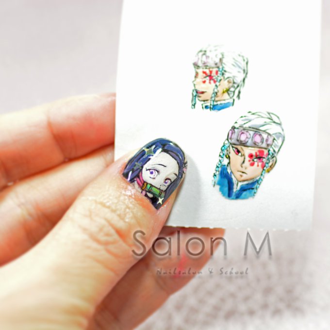 ジェルアート手描きだょ(*´ー`*) 初めて描いた #きめつのやいば のキャラクター #鬼滅の刃 #鬼滅の刃ネイル #鬼滅の刃イラスト #禰豆子 #ねずこ #宇随天元 #痛ネイル 好きなモノに対しては拘りが強くて妥協出来ない 推しが爪に居るって幸せ ネイルでハッピーをお届け♥️♥️♥️