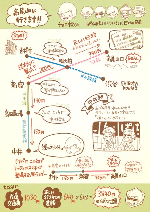 高尾山に向かったはずが 中井駅に着いてしまった 松野ブラザーズの軌跡を 妄想してみました!の図 「旅のしおり」には ちゃんとした行き方 書いてあって笑った 何を見てたの…三男