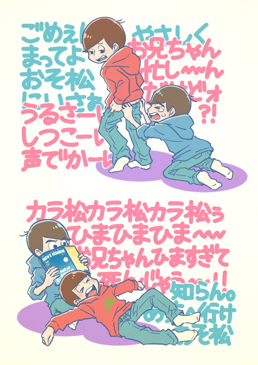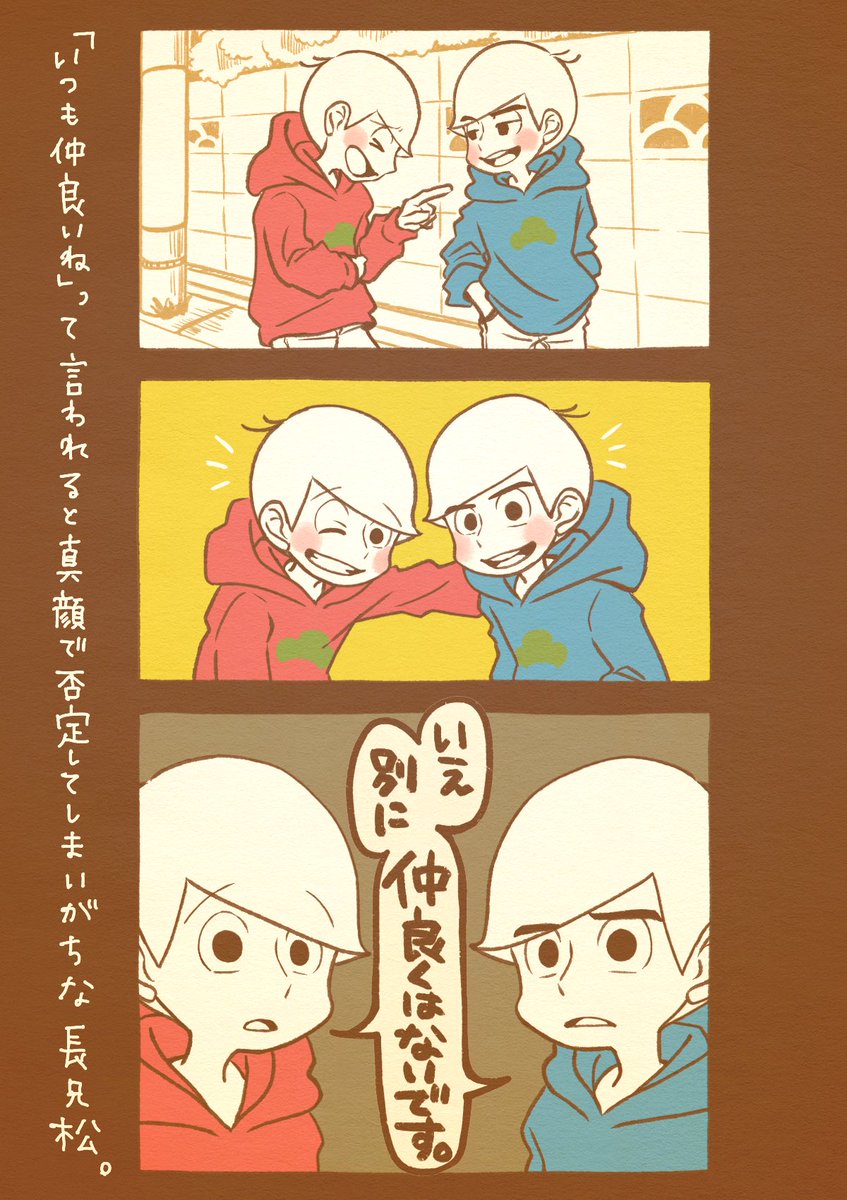 仲が良さそうに見えるのに 本人たちにその意識はない っていう松野家ツートップ (が、見たいっていう話) うろ覚えだけど…松野家電話で 「今からカラ松とパチンコ~」 っておそ松兄さんが言うやつの 日常感がすごくすきだったんだ 仲良しだと思われるのは不本意! くらいの心で仲良くしててほしい