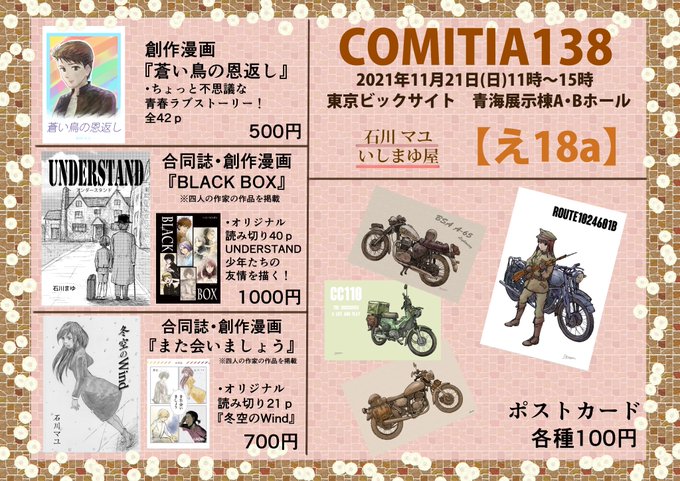 明日開催の #コミティア143 よろしくお願いします✨新しいものはないのですが、創作漫画やポストカードなどあります。のんびりスペースにいますので、お気軽にお越しください❣️ twitter.com/itukano_sora/s…