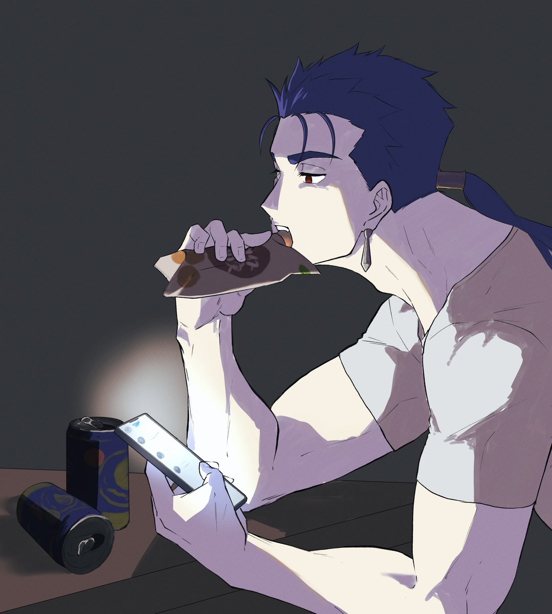 りょくさん(@ryokkun35 )が呟いていた『真夜中に死んだ目しながら、缶チューハイを開けつつアイスの実を袋から直接食べる』ランサーがみたくて描きました。