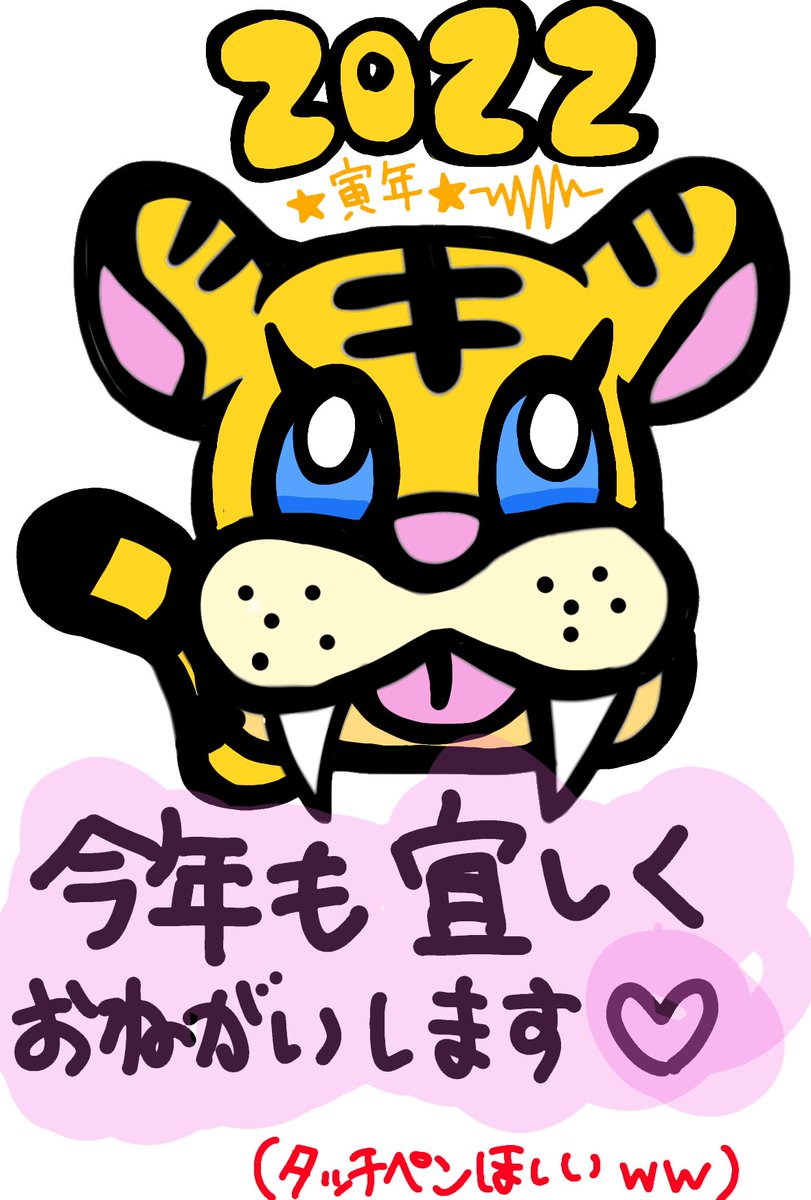 超遅れましたが、初々しいデジタルイラストで今年の挨拶♪ 寅年ですな♡ 街中が黄色い模様でキラキラでハッピーに染まりますように! あつ森のぴょんたろうみたいな顔になってる……?? #イラスト好きな人と繋がりたい #寅年