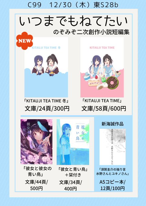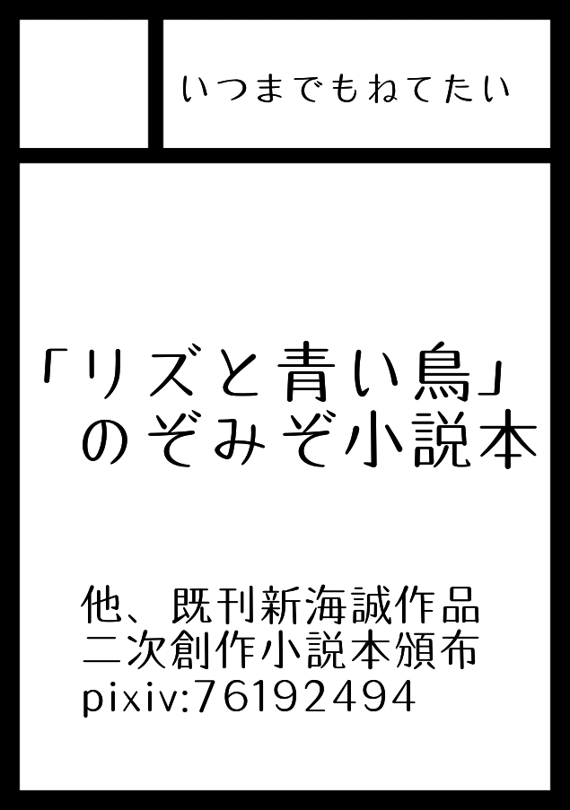 【既刊小説】「彼女と青い鳥」 希美とみぞれの日常系短編小説。4編を収録した短編集。 希美とみぞれが電車で京都駅まで一緒に向かう話やみぞれが希美からたまごをもらう話等収録。 サンプル→pixiv.net/artworks/78388… #C99 #コミケ99