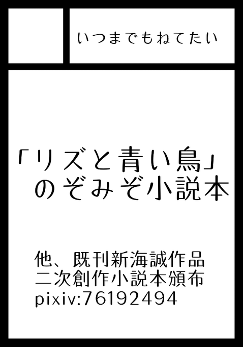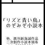 【C97新刊】 リズと青い鳥二次創作小説短編集「彼女と青い鳥」(のぞみぞ+梨々花)を入稿しました! 表紙はむじ(@uimss)さんに素敵なイラストを描いていただきました! 後日お品書きをUPします。 よろしくお願いします。 #C97 #C97WebCatalog