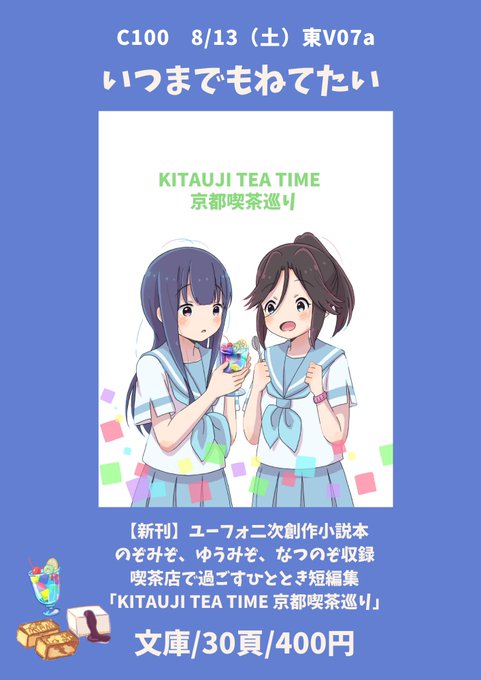 #C100 お品書き公開! ユーフォ二次創作小説 喫茶店でのひととき短編集 新刊「KITAUJI TEA TIME 京都喫茶巡り」を頒布。 iceteaさん(@ice_kyoani)のイラストが目印です! ◆書店委託先 →melonbooks.co.jp/detail/detail.… ◆配置場所 →webcatalog-free.circle.ms/Circle/16210904 #C100新刊 #C100お品書き #C100