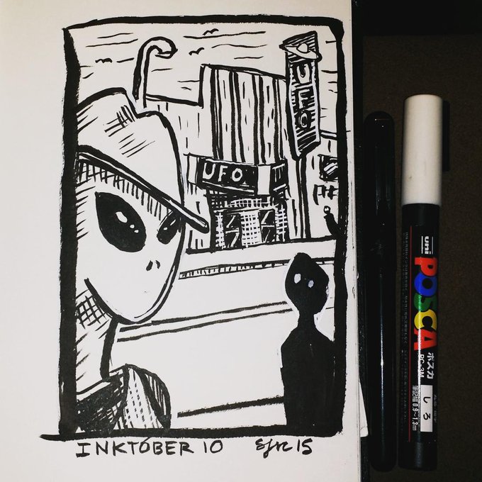 #inktober / #drawlloween2015 day 10: alien (visiting the Roswell UFO museum) #pentelpocketbrushpen #stillmanandbirn