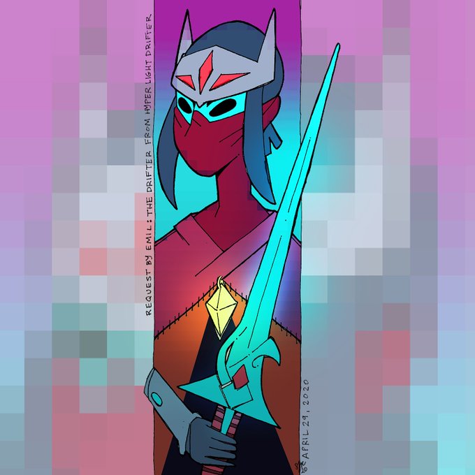 1st of the #sixfanarts challenge, requested by Emil (@EmiliusDraws): the Drifter from Hyper Light Drifter! Penciled, Inked, then into Photoshop for color and FX. I've still got 2 empty slots. Going to do Spongebob, the YipYip Aliens from Sesame Street and Willow from DST. #fanart