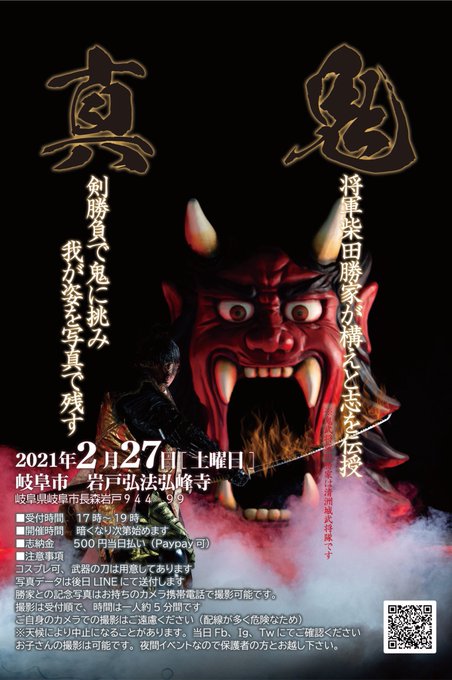 20 81 【#鬼撮影会 】 武将、#柴田勝家 が構えと志を伝授。 スモークを使った特撮を行います。 2023年1月14日(土) 開催時間17時ごろ(暗くなり次第) 志納金 500円当日払い #特撮好きの人と繋がりたい #お寺イベント #岐阜の鬼 #節分の鬼 #節分祭 #岩戸弘法弘峰寺 #鬼と写真撮影 #コスプレ 23/01/06 19:28