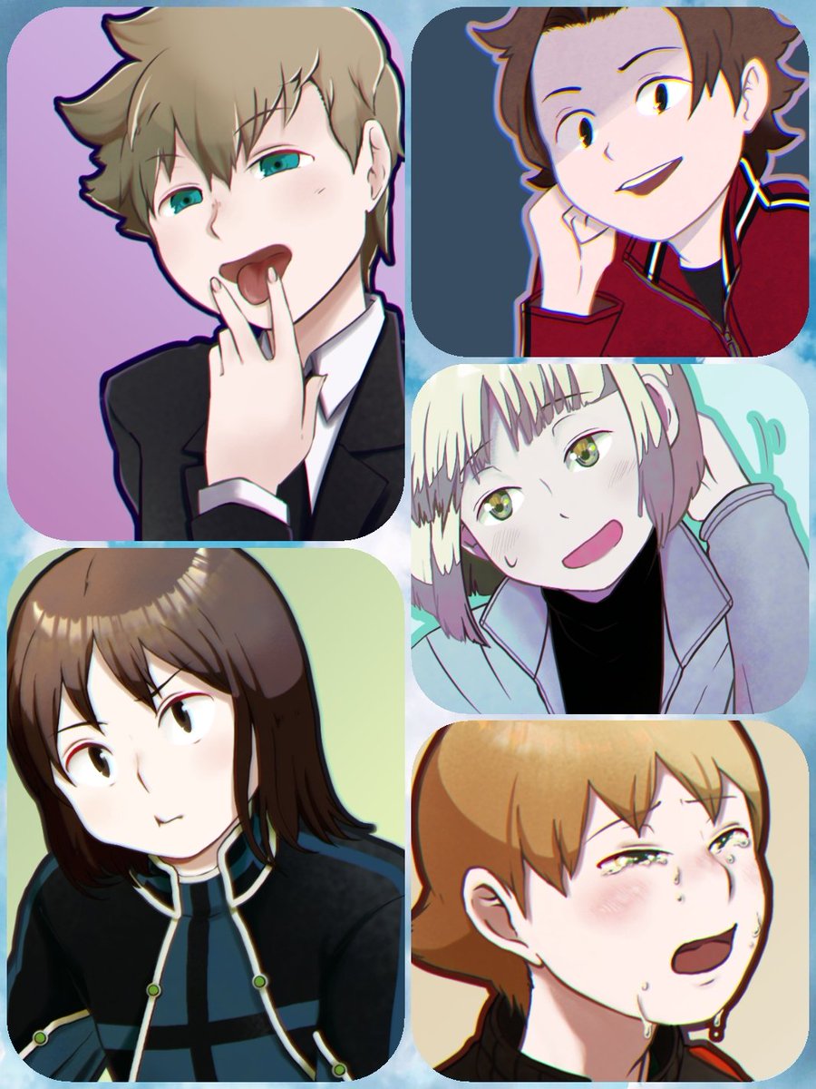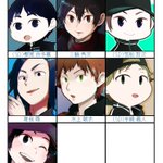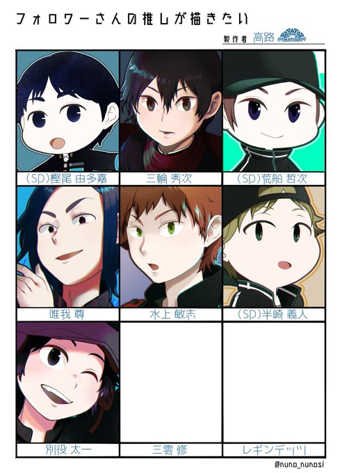 長らく描いておりました推しが描きたい完成しました~ 等身が若干ばらばら…。 全体像イコさん、隠岐くん、水上くんだけ一緒に上げます。 他のキャラもツリーに繋げますので、よければご覧ください。リクエスト下さった皆様ありがとうございました~🙏 #フォロワーさんの推しが描きたい