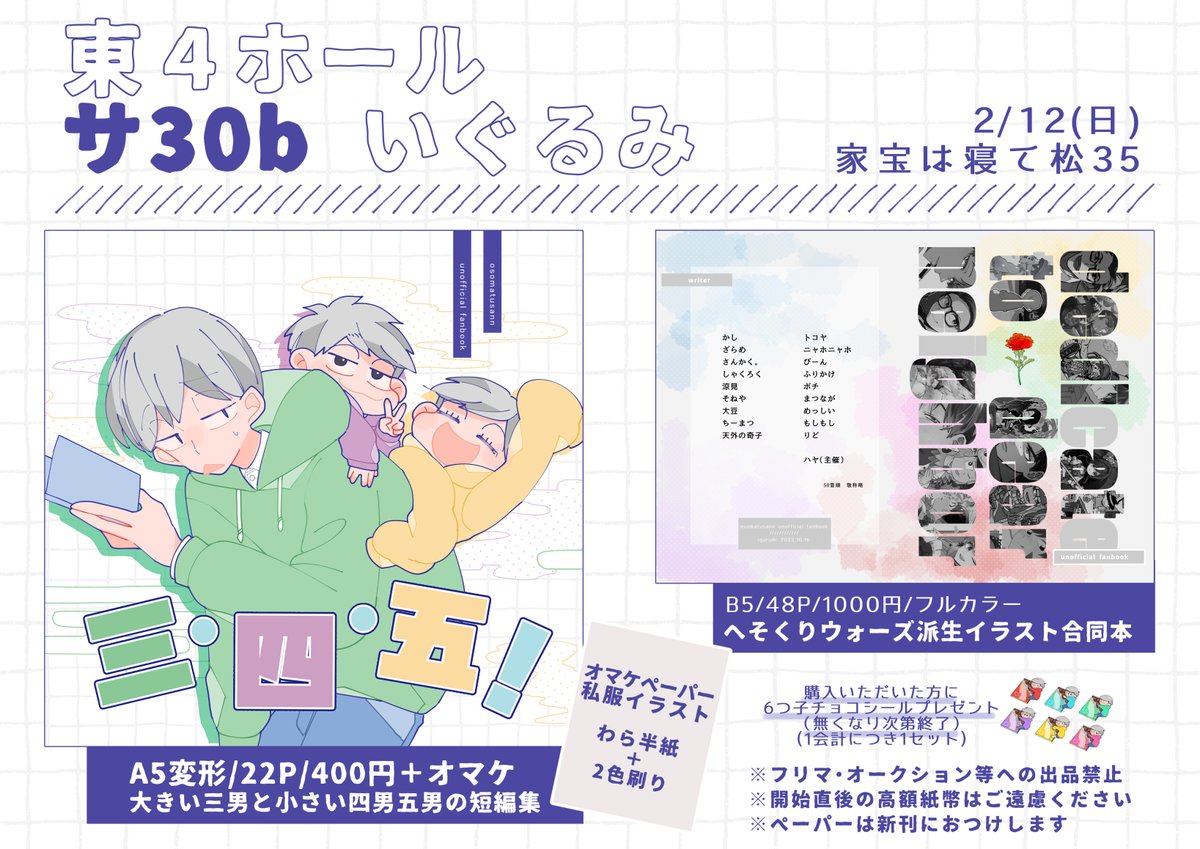 5/3 家宝は超寝て松 2023 東4せ34a いぐるみ イラストログ本 A5/フルカラー/36P/500円(会場価格) 通販:ecs.toranoana.jp/joshi/ec/item/… pixiv:pixiv.net/artworks/10751… ※カプ無し、オールキャラ