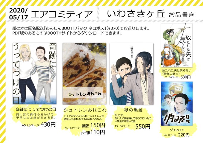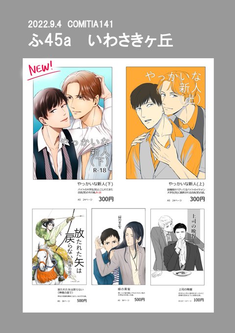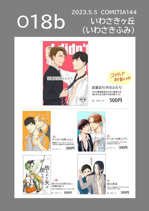 5/5コミティアのお品書きです。 新刊は12pほのぼのBLコピー本、コミティア初売りのBL本があります。その他既刊やペーパーなど。お気軽にお立ち寄りください😊 コピー本はツリーにサンプル載せますのでご覧ください〜 #COMITIA140 #コミティア140 #コミティア140お品書き