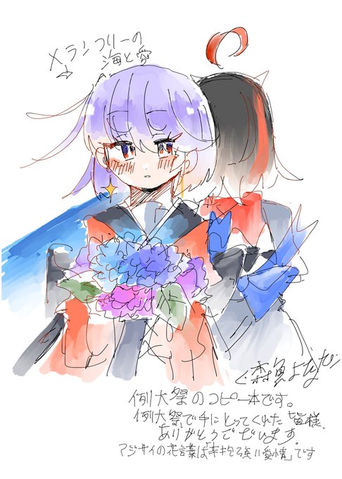 23 61 pixiv.net/artworks/10033… 例大祭でコピー本として配布した 「メランコリーの海と愛です。」もしよろしければご覧ください。 22/08/08 22:09