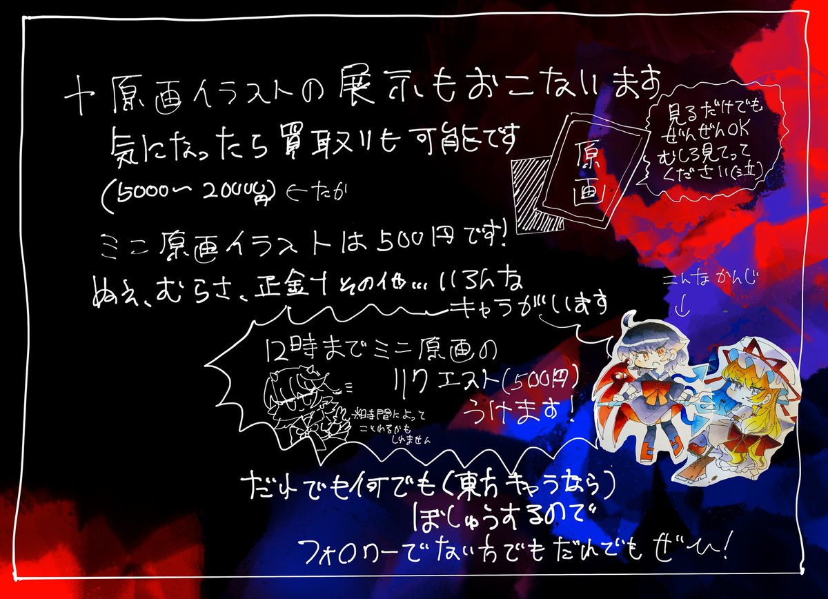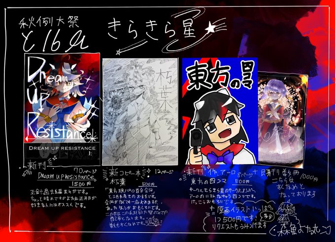 秋例大祭きらきら星のお品書きです✨ 100円イラストのリクエストやミニ原画もあるので皆様よろしくお願いします…🙇♀️🙇♀️🙇♀️🙇♀️