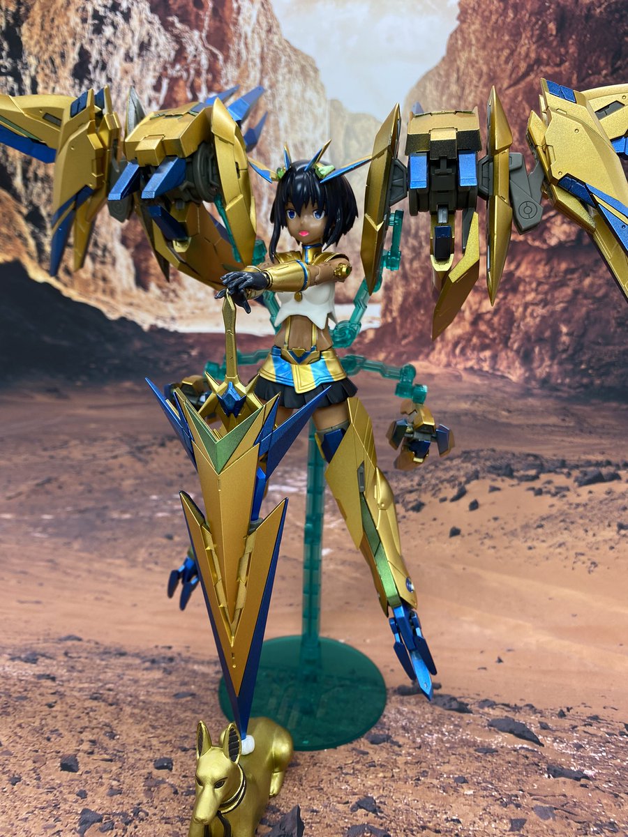 ホルス神金潟すぐみちゃんできました 肌色はラスキウス02+05に半光沢トップコート吹きました 色分けがすごいので塗装大変でしたが完成時満足度高いです #メガミデバイス #エジプト娘