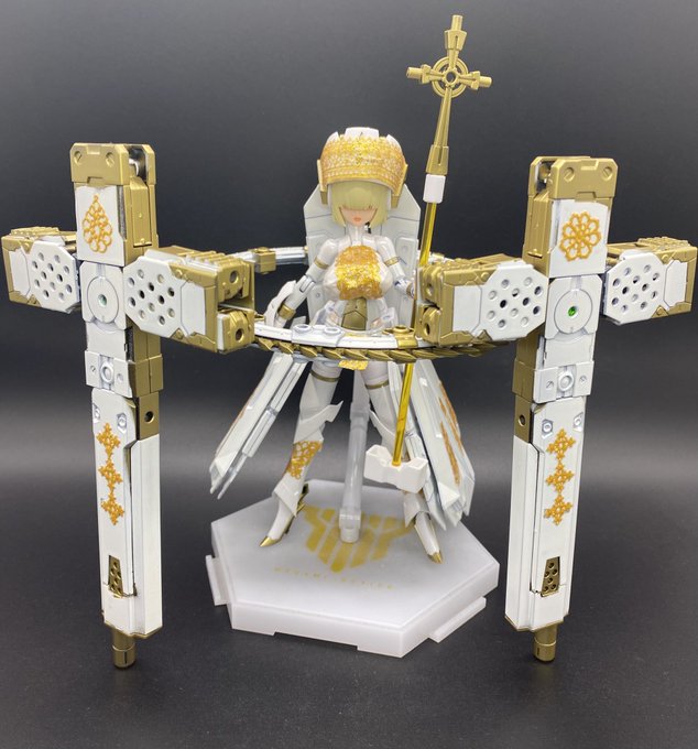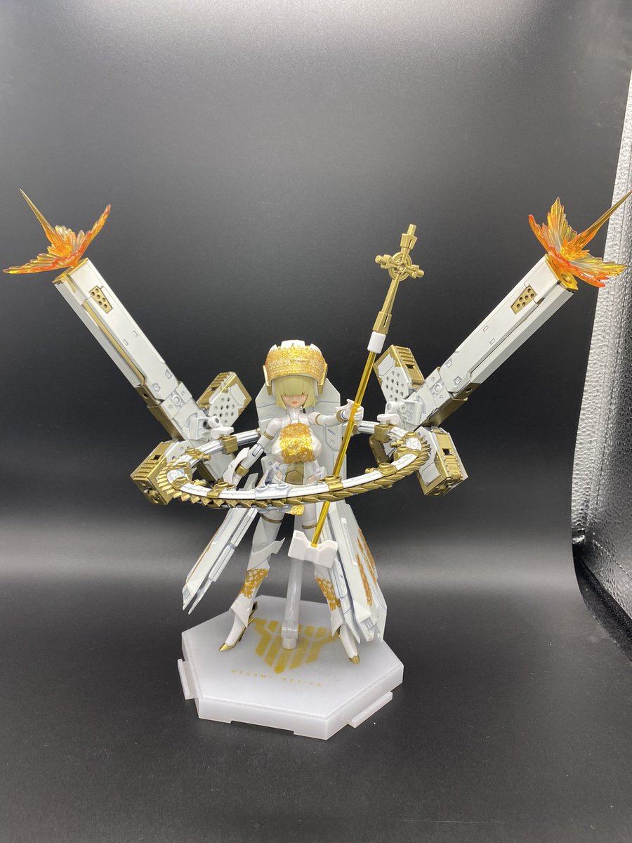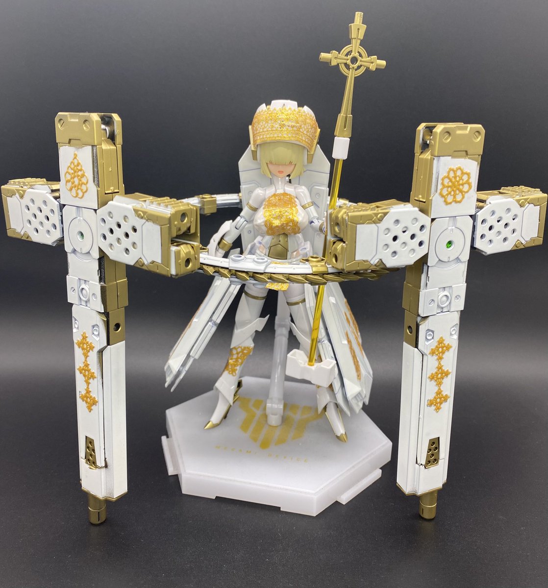 エクソシストアーチビショップできました! 白色はベースホワイト+キャラクターホワイト上からホワイトパールを吹きました セリアのレースシールを見て思いつきました #メガミデバイス