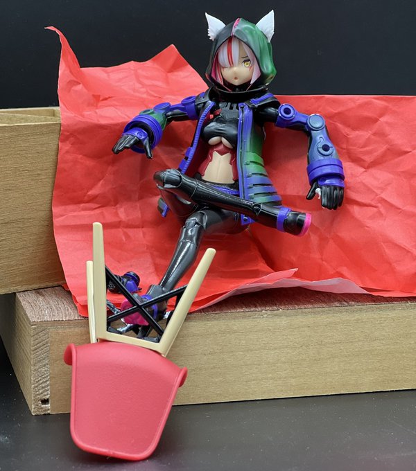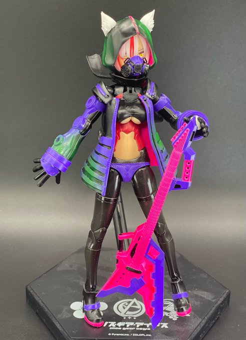 7 30 サイバーパンクしできました ガレキに塗装は難し何度も失敗したし頭巾を切りすぎて隙間できた 蛍光食初めて使ったけどこれも扱いが難しい とても難産な娘だったけどなんとか形になった #メガミデバイス 22/02/12 23:16
