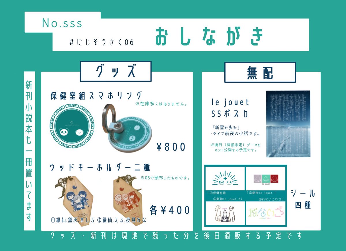 #にじそうさく06 お品書き完全版です!保健室組メインのグッズや、るじゅえの無配など持っていきます。 当日よろしくお願いします🙌