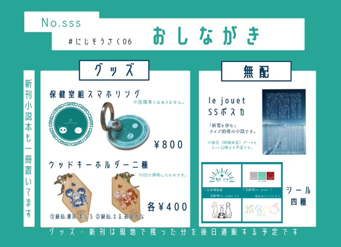 6 28 #にじそうさく06 お品書き完全版です!保健室組メインのグッズや、るじゅえの無配など持っていきます。 当日よろしくお願いします🙌 22/05/03 18:13