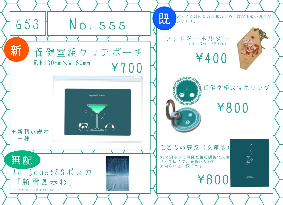 1 3 #にじそうさく07 お品書きです。 保健室組のグッズと小説本、le jouetの SS無配があります。 よろしくお願いします。 23/05/01 03:02