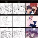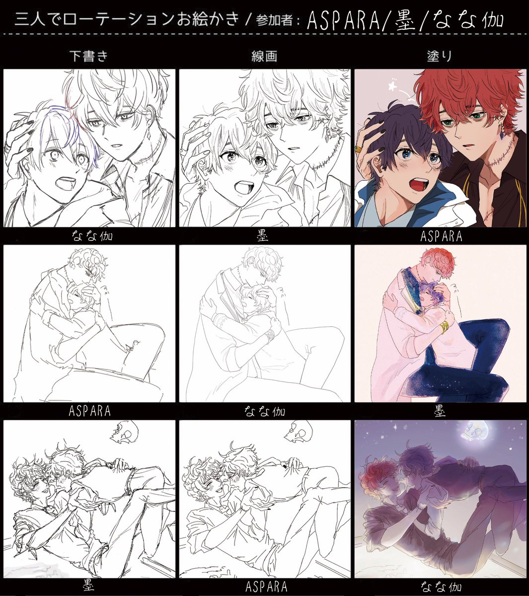 ASPARAさん(@ aspara_umai)と墨さん(@ IMUSUMIO)の3人でミス晶♂をテーマにローテーションしました! 最高に楽しかったし、すごく勉強になりました…!ありがとうございました!!🥰 #3人でローテーションお絵描き