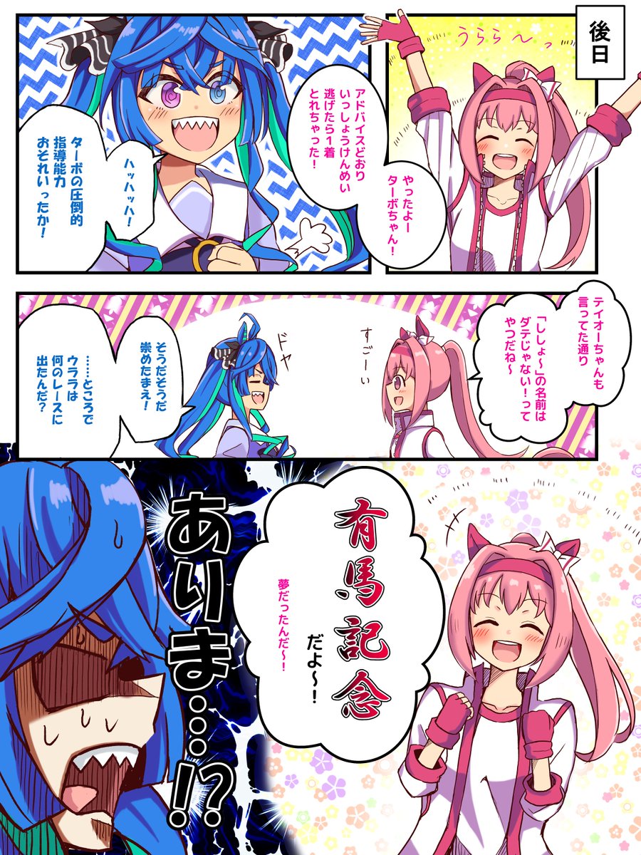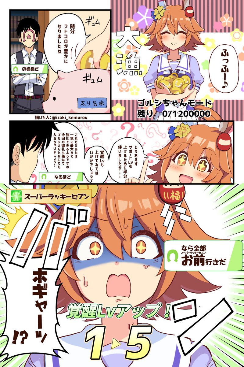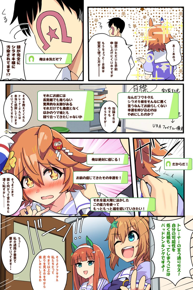 #ウマ娘 まだまだ自分に自信がないフクキタルとなんだかんだフクキタルへの信頼が強いトレーナーさんとゴルシちゃんモードで得た金を大量に溶かして手に入れたスーパーラッキーセブンの漫画です #ウマ娘プリティーダービー
