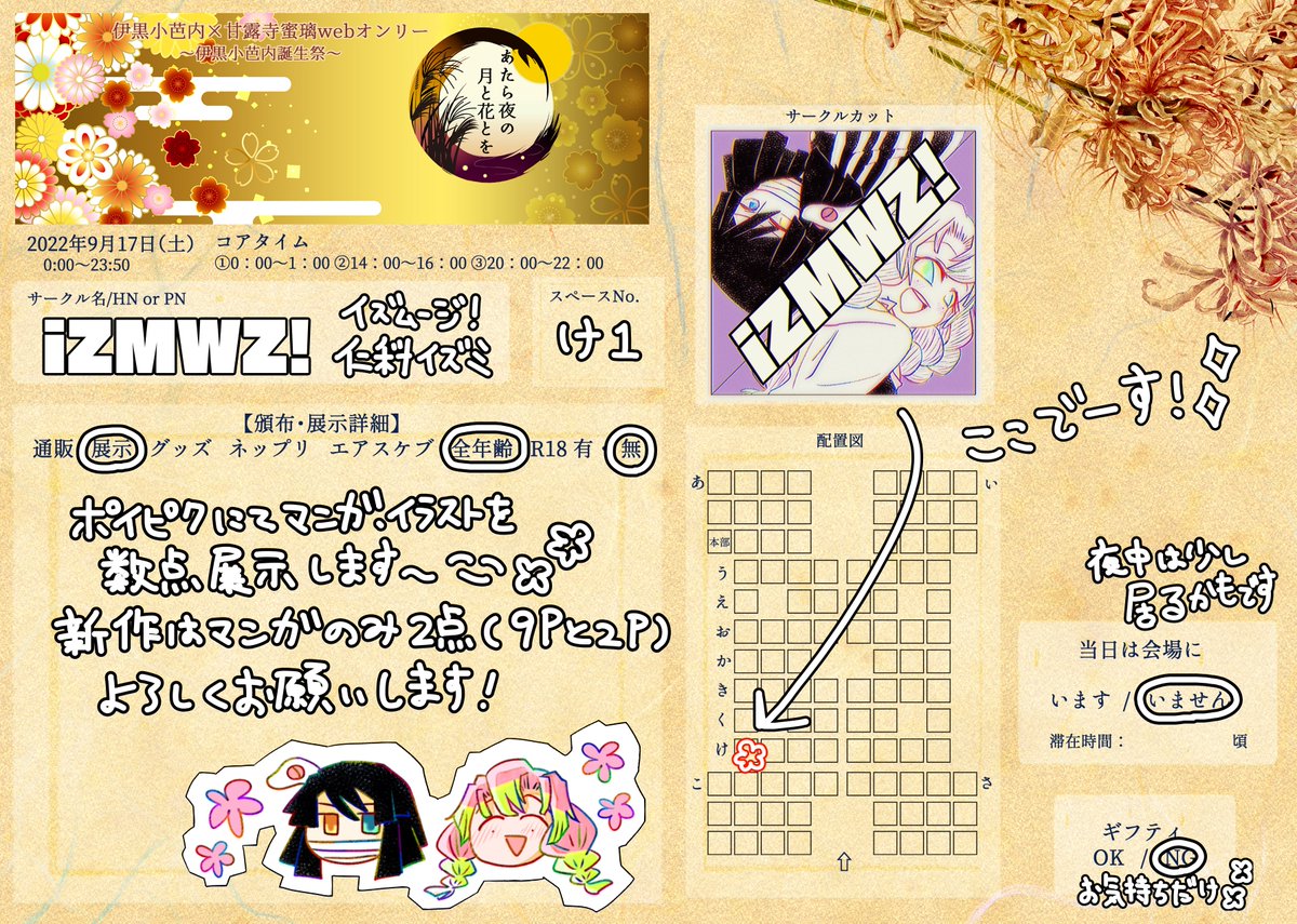 16 44 主催者様、Webオンリーの開催ありがとうございます! 🐍🍡✨✨ 新作は昨年の誕生日絵の続きの漫画と短いものを2p、ポイピクで展示します〜! どうぞよろしくお願いします🙇♀️🌸#あたらよ0832 22/09/16 16:54