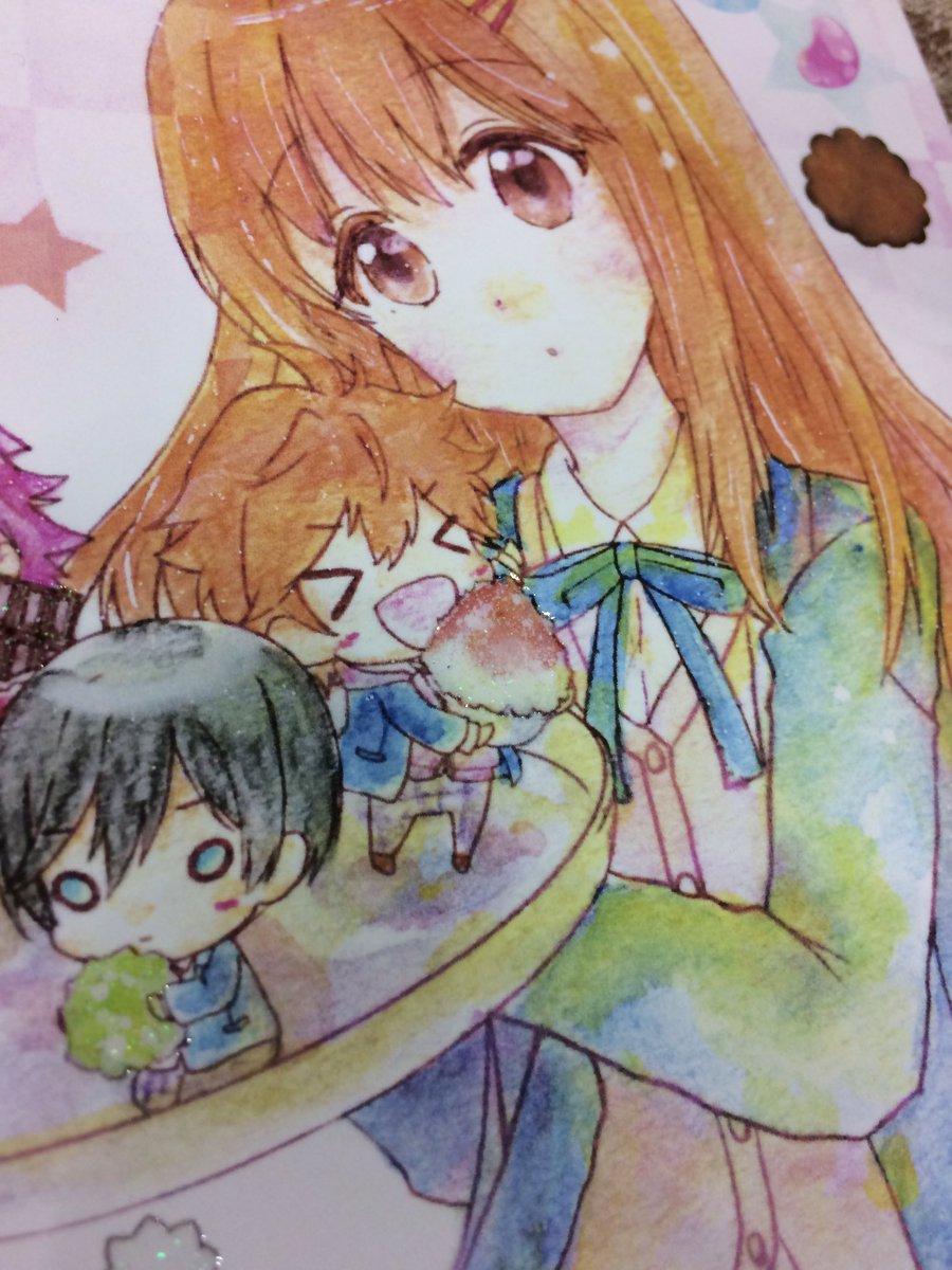 新刊トリスタあん本とノベルティのしおりこんな感じに印刷していただきましたー!写メじゃ分かりにくいけどお菓子部分にエナメルラメ加工が施してあります!キラキラです⁎⁺˳✧༚