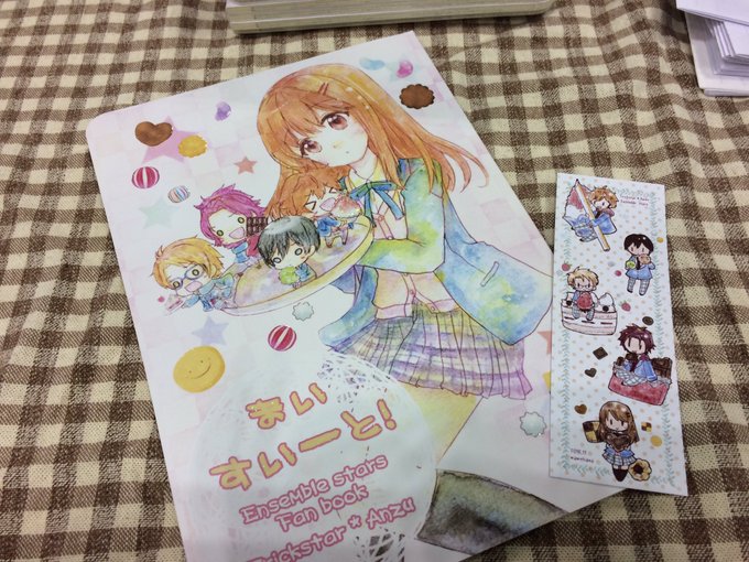 5 6 新刊トリスタあん本とノベルティのしおりこんな感じに印刷していただきましたー!写メじゃ分かりにくいけどお菓子部分にエナメルラメ加工が施してあります!キラキラです⁎⁺˳✧༚ 18/11/24 09:45