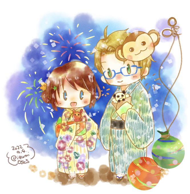 お題「花火」まこあん (+30分) RT期限ギリギリ参加ですみません💦 あんずちゃんの浴衣の柄は『朝顔の君』です #あんず島ワンドロライ