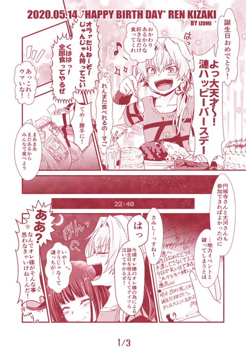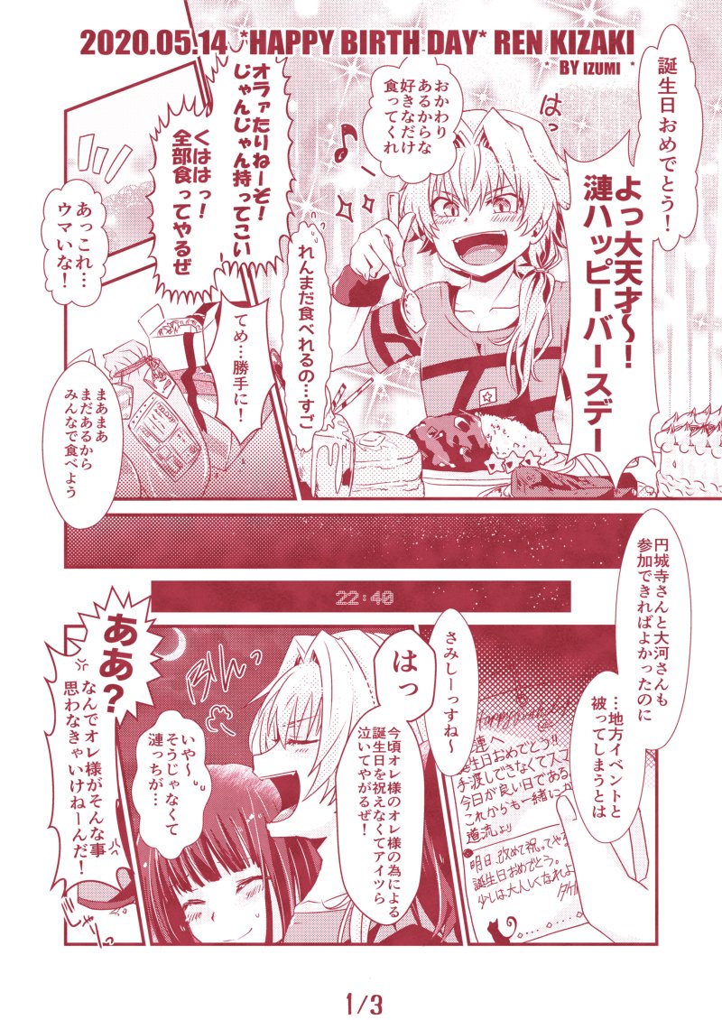 漣~!お誕生日おめでとうございます! 一周まわってユニットで一緒に居るの至高だなぁって。 美味しいもの沢山たべてこれからも健康で一番でいてね~! #牙崎漣誕生祭2022 #牙崎漣生誕祭2022