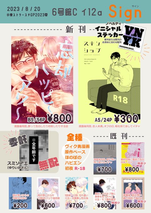 スペース:②あ7 サークル名:Sign pixivにて↓3作品+初期3作品のWEB再録を予定しています。 ※準備が終わらなかったので開催時間には間に合わないのですが、7日中にはご用意したいと思います…すみません! #花束8サークル専用