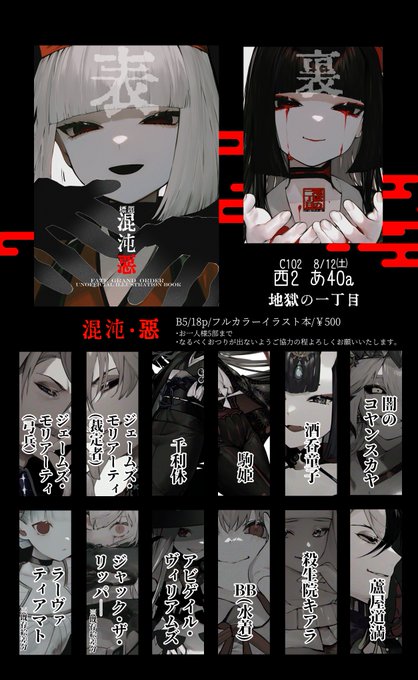 2849 10.4K c102お品書きです。 混沌・悪サーヴァントの悪い顔、暗い雰囲気で構成されたフルカラーイラスト本です。 よろしくお願いいたします。 23/08/05 20:00