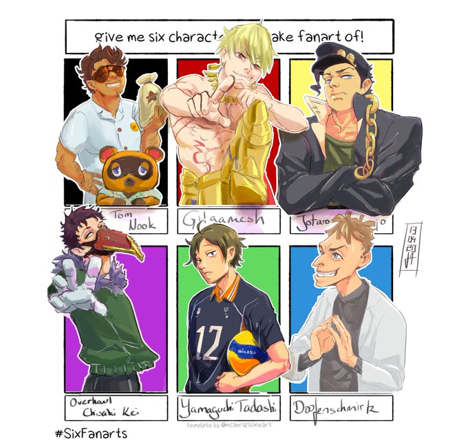 I asked on Insta and Doofenschmirtz is by far my fav here XDD They look like a weird mafia group XDD Right to left: Tom Nook, Gilgamesh, Jotaro, Overhaul, Yamaguchi, Dr.Doofenschmirtz #SixFanarts #SixFanartsChallenge