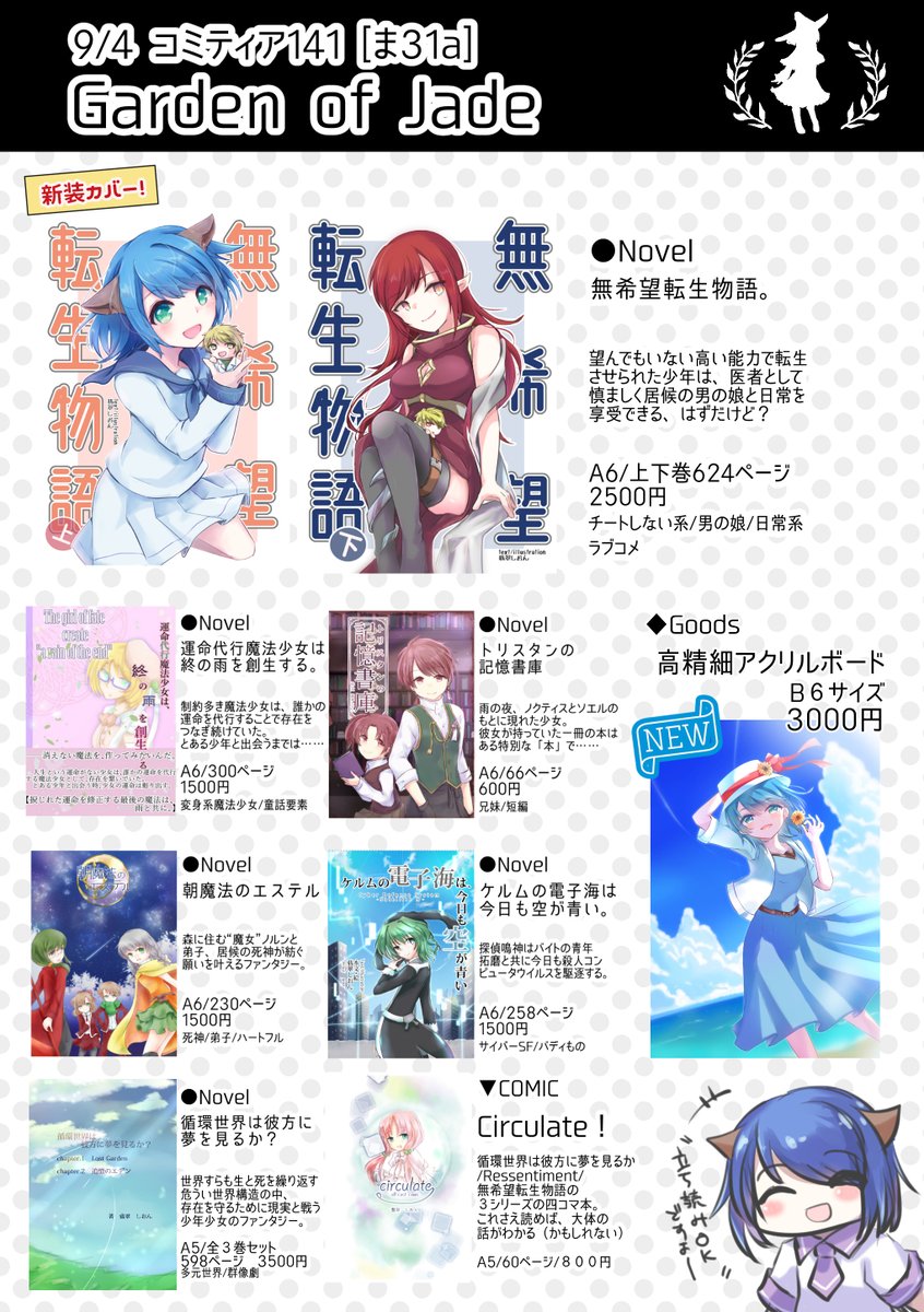 18 3 コミティア141のお品書き作りました!当社は「絵柄だけは可愛いけど、割とシリアスの話多め」の小説たくさん置いております。高精細アクリルボード、数量限定なのでどうぞよろしくお願いします。 「ま31a」で当日はお待ちしております! #コミティア141 22/08/27 18:39