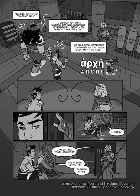 Here's the full comic that @corviiid and I made for @LifebloodHades! ❤️ Rewind to the first day of training... Zagreus and Achilles build an unshakable bond. #HadesGame (1/5)